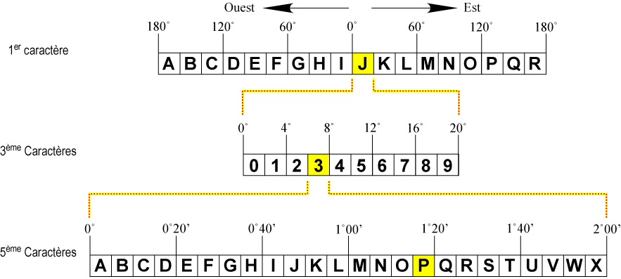 CALCUL LOCATOR La terre est divisée en zones, carrés et petits carrés. Ce système s'appelle Locator. Le repérage se fait d'Ouest ver s l'Est pour les longitudes et du Sud vers le Nord pour les latitudes. Le premier niveau du Locator est la Zone (Field). Il représente des surfaces de 20° en longitude et de 10° en latitude. Son repérage part du Méridien -180 vers l'Ouest et du pôle Sud vers le Nord. Chaque zone est repérée par deux lettres majuscules allant de AA à RR. Le second niveau est le Carré. Chaque zone est divisée en 100 carrés. Chaque carré à donc une hauteur de 2° et une hauteur de 1°. Les carrés sont repérés par deux chiffres allant de 00 à 99. La troisième et dernière zone est le Petits Carrés. Chaque carré est divisé en 24 colonnes de 5 minutes et de 24 bandes de 2.5 minutes. Chaque petit carré est repéré par deux lettres majuscules allant de AA à XX. Le Locator est donc repéré par 6 caractères (2 lettres, 2 chiffres et encore 2 lettres). Pour déterminer un Locator, il est donc indispensable de connaître les coordonnées (Longitude et Latitude) du point à déterminer. Pour les exemples de calcul, nous utiliserons les coordonnées de la plus belle ville du monde ...NICE : Place Masséna : Latitude : 43°41'47"N, Longitude : 7°16'15"E La première méthode de détermination du Locator se base sur un graphique publié dans "Radio Communication" (revue de la Société Nationale Anglaise), par GM4ANB. Graphique des Longitudes : La Longitude de la Place Masséna à NICE est de 7°16'15"E. Sur la première partie de graphique, nous sélectionnons la lettre "J" qui correspond aux valeurs allant de 0 à 20 degrés. Dans la seconde partie, nous sélectionnons le chiffre "3" qui correspond aux valeurs allant de 6 à 8 degrés (en plus du 0° au dessus); et enfin dans la dernière partie, nous sélectionnons la lettre "P" qui correspond à la plage allant de 1°15' à 1°17'30'' (en plus des 6° de la ligne précédente et des 0° de la première ligne). Le premier caractère du Locator est donc le "J", le troisième le "3" est le cinquième le "P", soit J3P pour la Longitude. Graphique des Latitudes : La Latitude de la Place Masséna à NICE est de 43°41'47"N. Sur la première partie de graphique, nous sélectionnons la lettre "N" qui correspond aux valeurs allant de 40 à 50 degrés. Dans la seconde partie, nous sélectionnons le chiffre "3" qui correspond aux valeurs allant de 3 à 4 degrés (en plus du 40° au dessus : 40+3=43°); et enfin dans la dernière partie, nous sélectionnons la lettre "Q" qui correspond à la plage allant de 40' à 42'30" (en plus des 3° de la ligne précédente et des 40° de la première ligne). Le second caractère du Locator est donc le "N", le quatrième le "3" est le sixième le "Q", soit N3Q pour la Latitude. Le Locator est donc JN33PQ. Ce Locator couvre la zone allant de 7°15' Est / 43°40' Nord à 7°17'30" Est / 43°42'30" Nord Nous allons maintenant voir comment calculer le Locator.